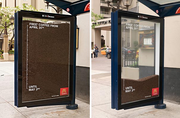 4月20号~5月3号麦当劳免费供应咖啡。咖啡豆做成的沙漏记录时间的流逝,直观地告诉你:Deadline越来越近了,还不Hurry up?(Advertising Agency: Cossette West, Canada)